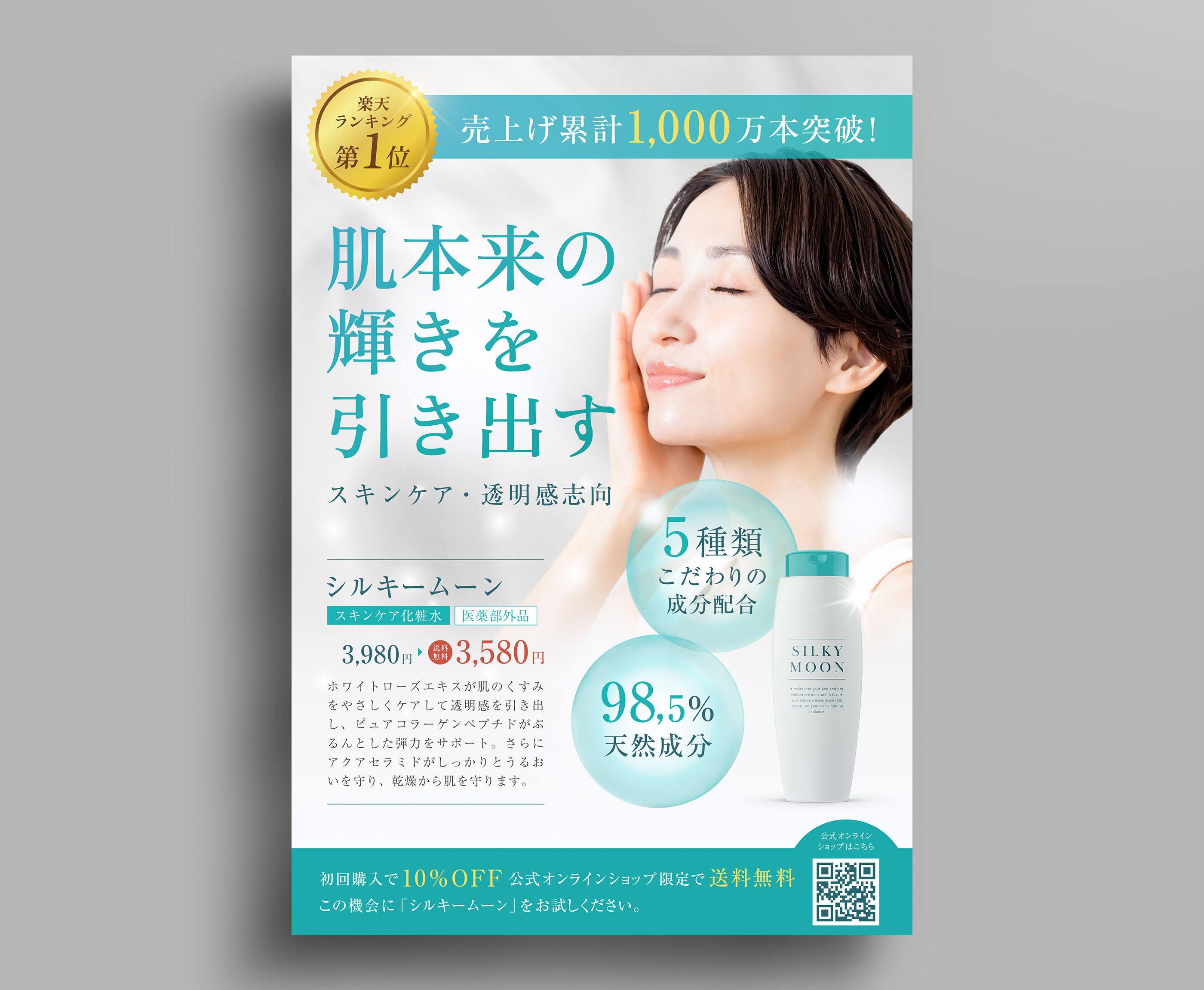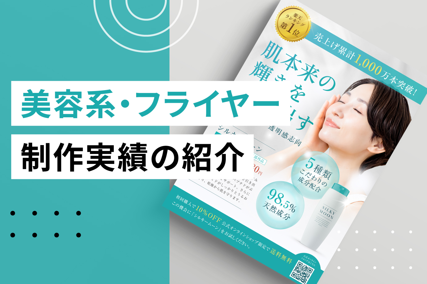 スキンケア化粧水「シルキームーン」のECサイト誘導販促として、店舗の売り場に配置を想定したフライヤーを制作しました。