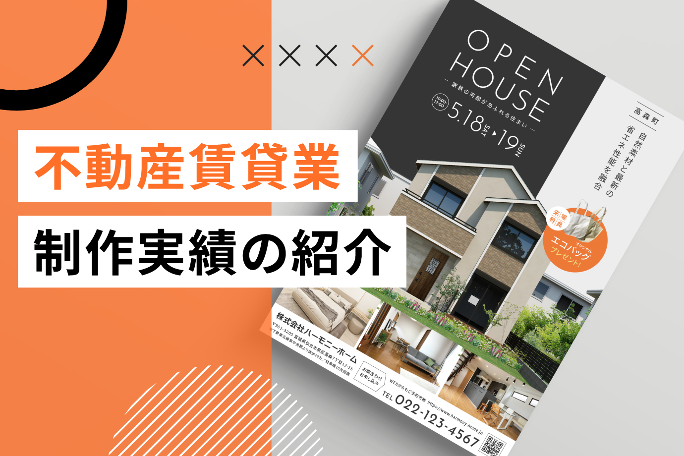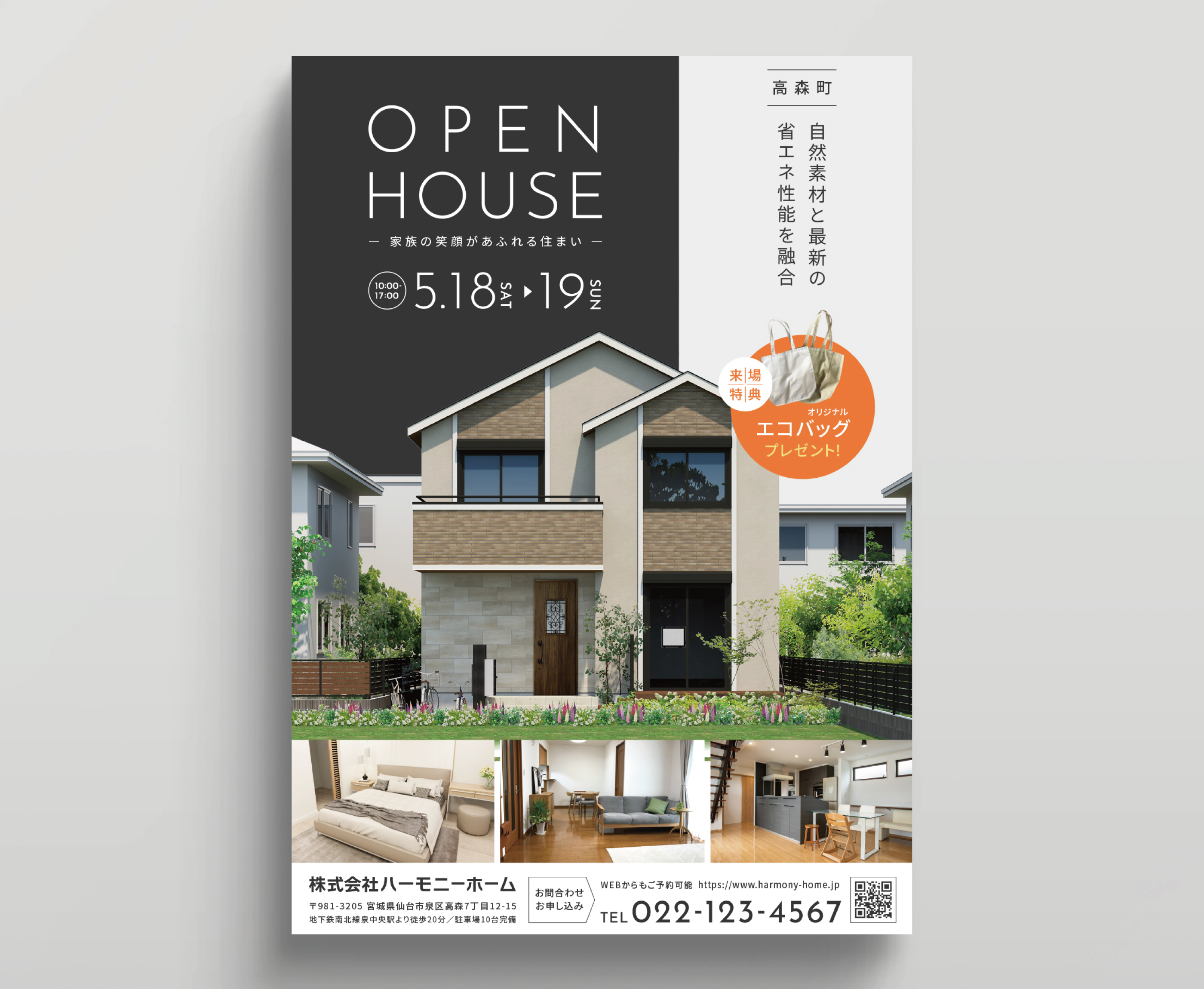 株式会社ハーモニーホーム様のオープンハウス見学会の告知販促として、ポスティングを想定したフライヤーを制作しました。