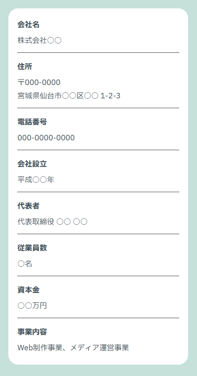 コピペして、色や幅を案件に合わせて調整してみてください。 会社概要の実装で迷った時の助けになれば嬉しいです!
