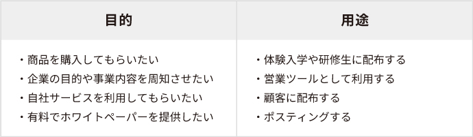 デザイン依頼の前に最低限用意しておくことは、「目的と用途を明確にしておくこと」です。まずは下記の目的と用途の例を御覧ください。