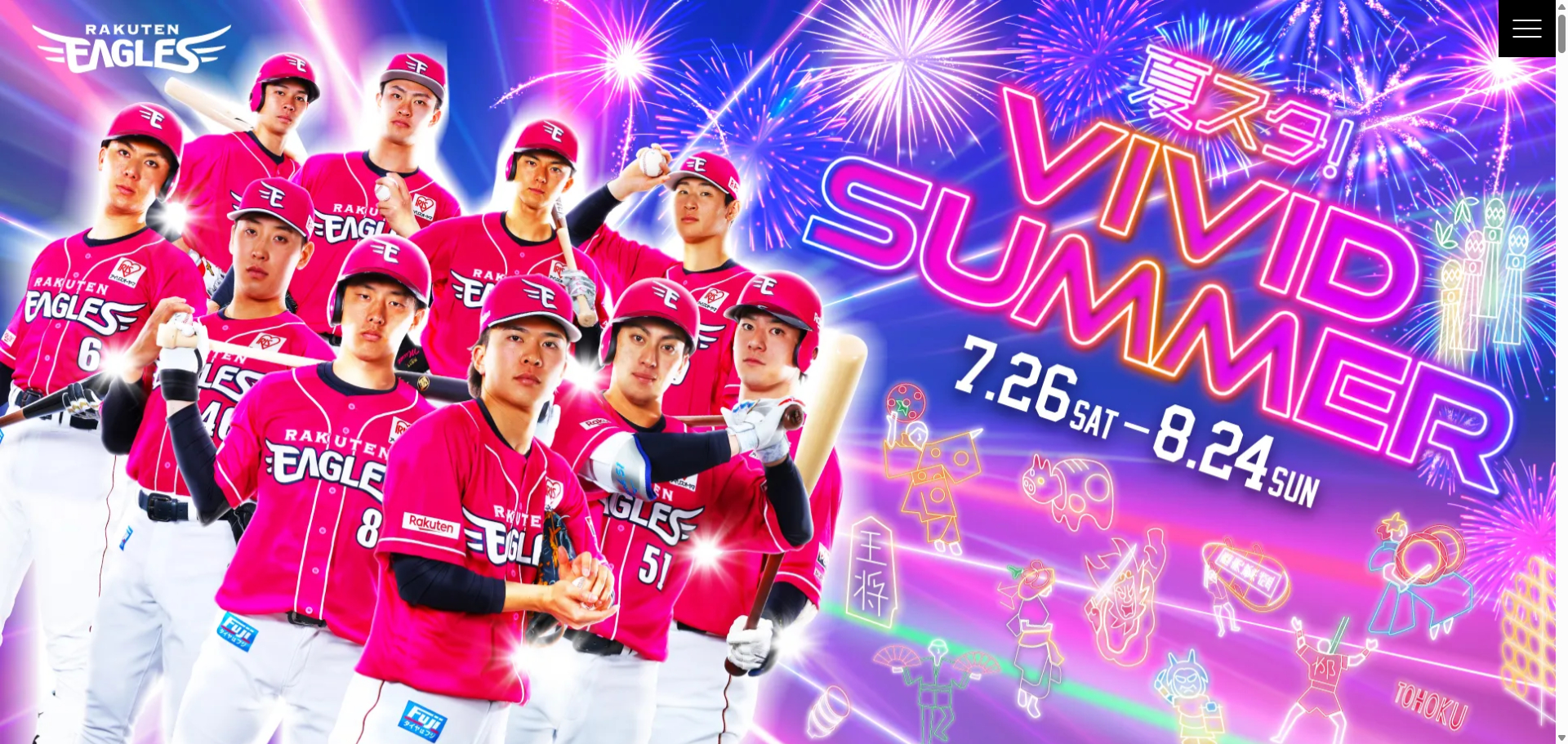 楽天イーグルスの今年の夏は「VIVID SUMMER」がコンセプト。光るトンネルやイルミネーション、花火など、VIVIDな色と光がバーク内を彩ります。また、試合観戦をしながら美味しいグルメに舌鼓を打つのも楽しみの一つ。パーク内ではイベント限定グルメや人気の牛たんメニュー、選手プロデュースメニューなど盛りだくさん!この夏は球場に足を運んで、みんなで「わしほー」しましょう!