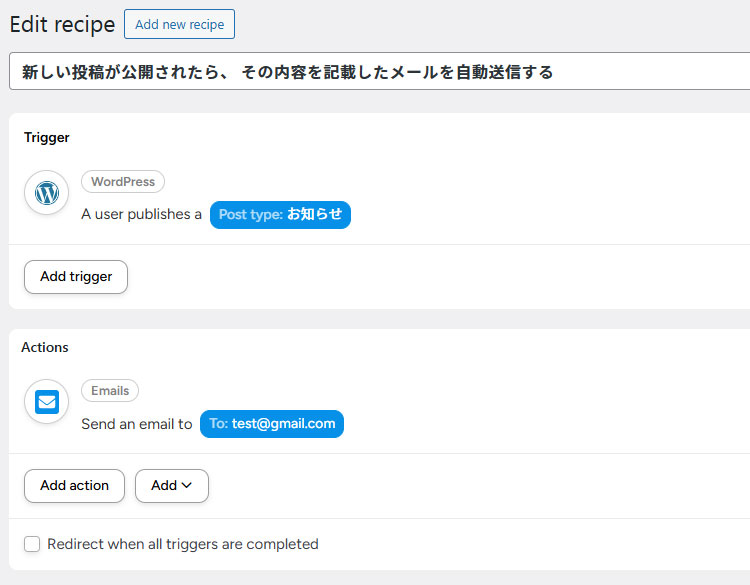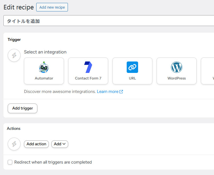 先程のプラグインの説明であった通りですが、「◯◯したら△△する」といった自動処理をここで設定していきます。○○(自動化を行うきっかけ)が「Trigger」で、△△(自動化する内容)が「Actions」に当たります。