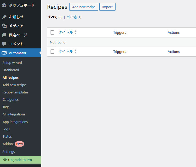プラグインを有効化すると、まず左サイドバーに「Automator」が追加されます。この中にある「All recipes」をクリックすると、以下のような画面が表示されます。