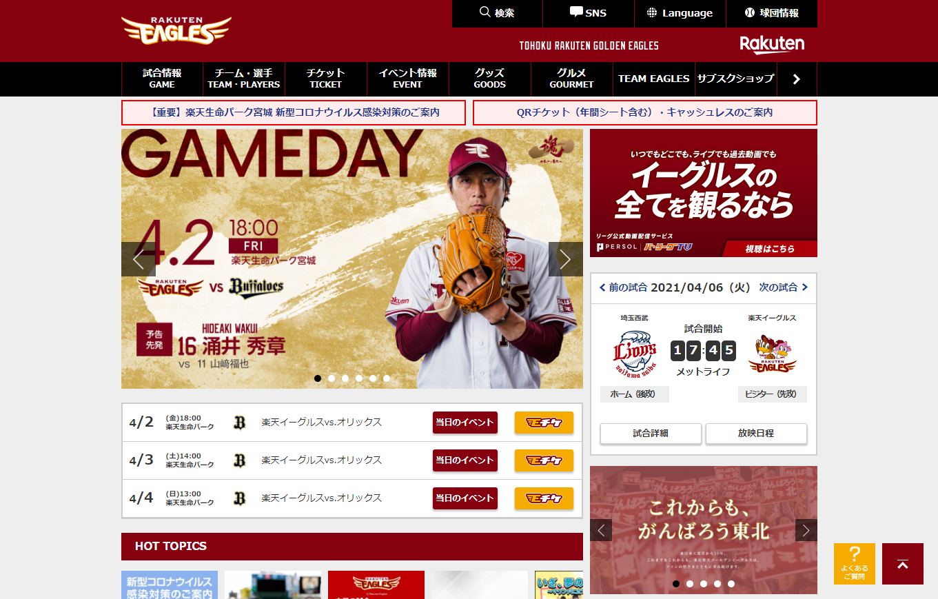 | 4月3日(土) | 14:00 | オリックス・バファローズ | 楽天生命パーク |