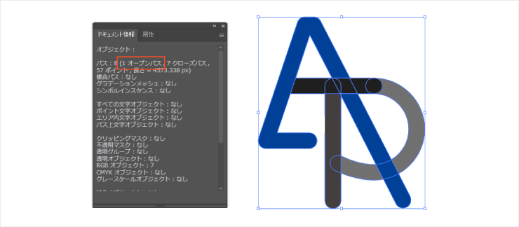 「ウインドウ」→「ドキュメント情報」→「右上メニューバー」→「オブジェクト」からオープンパスの数が表示されます。