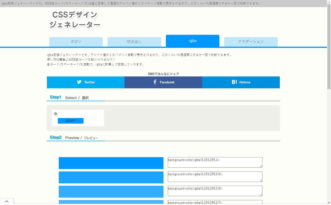 rgbaの数値を求めたい場合に使用しています。 画像の上に透明な色を重ねたい…そんな時によく使用しています。 任意のWEB色コードを入れるだけで、どのくらいの透明度がひと目でわかります。
