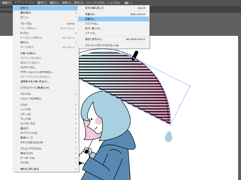 ①パターンを適用したオブジェクトを選んだ状態で「オブジェクト/変形/回転」と選択します。