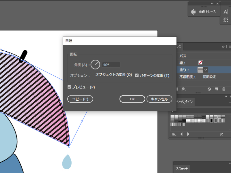 ②回転のウィンドウが表示されますので、角度「45度」、オブジェクトの変形のチェックは「OFF」、パターンの変形は「ON」にしてOKをクリックします。これでパターンを斜めにすることができました。