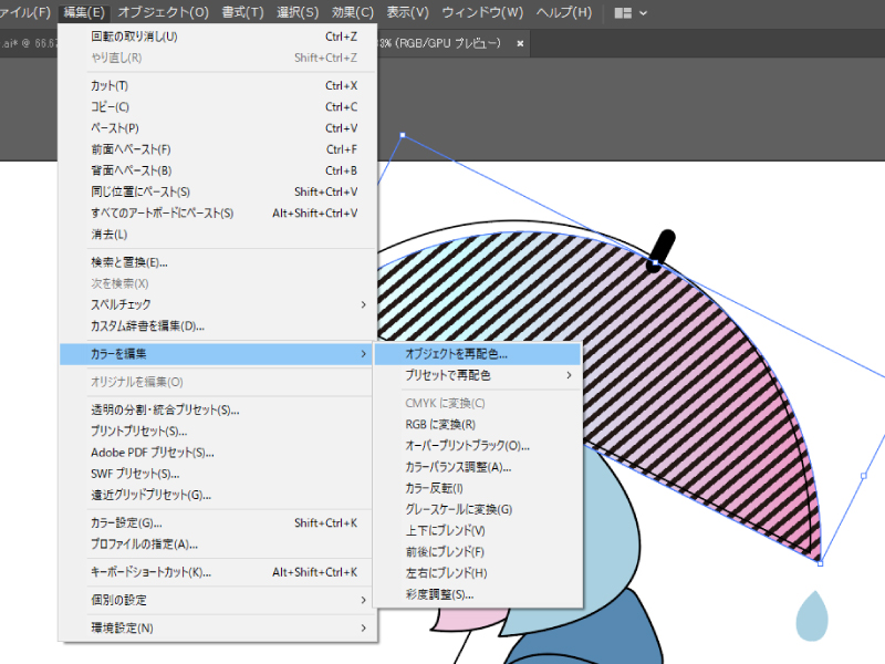 ①オブジェクトを選んだ状態で「編集/カラーを編集/オブジェクト再配色」を選択します。