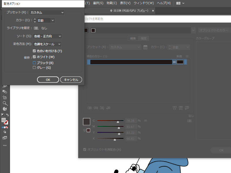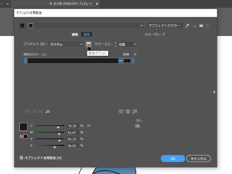オブジェクトを再配色パネルから色を変えたのに、変更されない場合があります。その場合は、配色オプションから「保持/ブラック」のチェックを外してください。