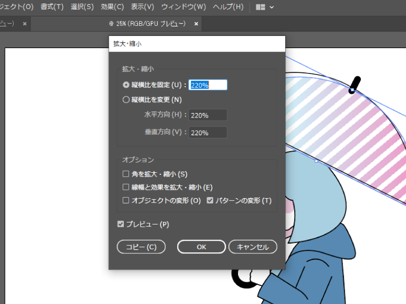 ②拡大縮小のパネルが表示されるので、縦横比を固定したまま比率(%)を変更してOKをクリックします。
