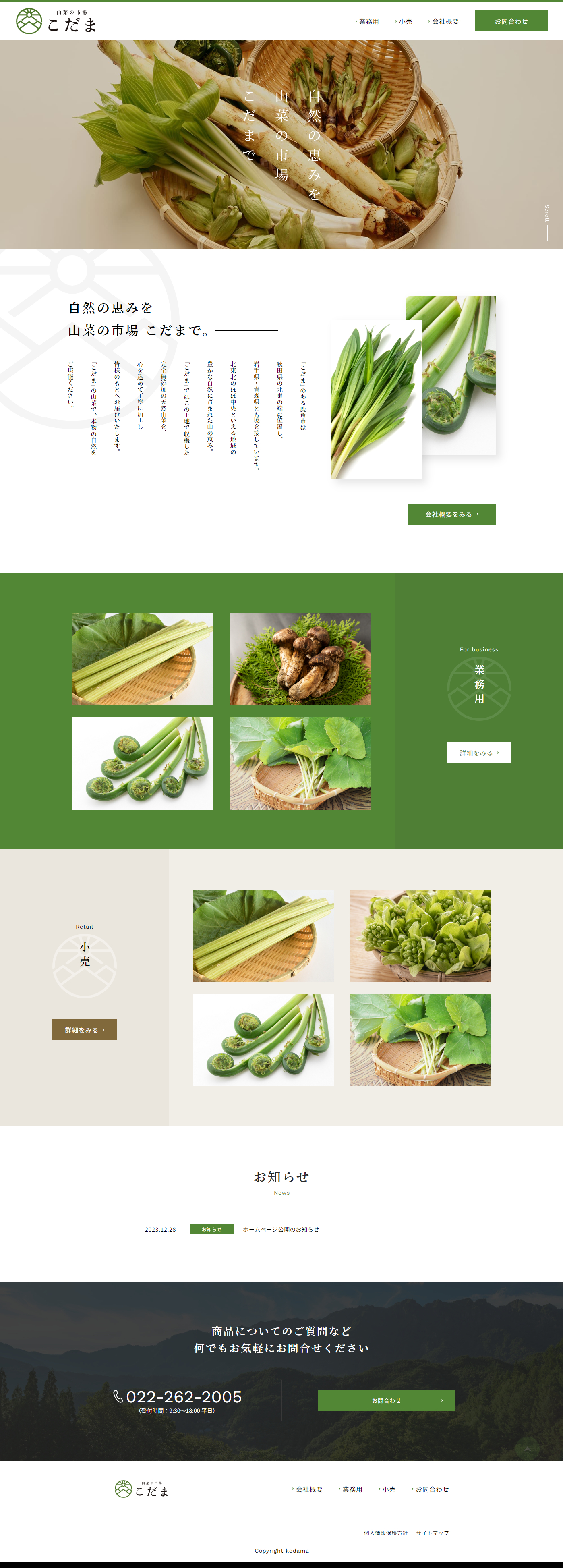 URL https://kodama-inc.com/ サービス内容 デザイン ディレクション サーバーホスティング サイト管理 山菜の市場 こだまのオフィシャルサイトです。北東北の豊かな自然に育まれた土地で収穫した、完全無添加の天然山菜を販売しています。