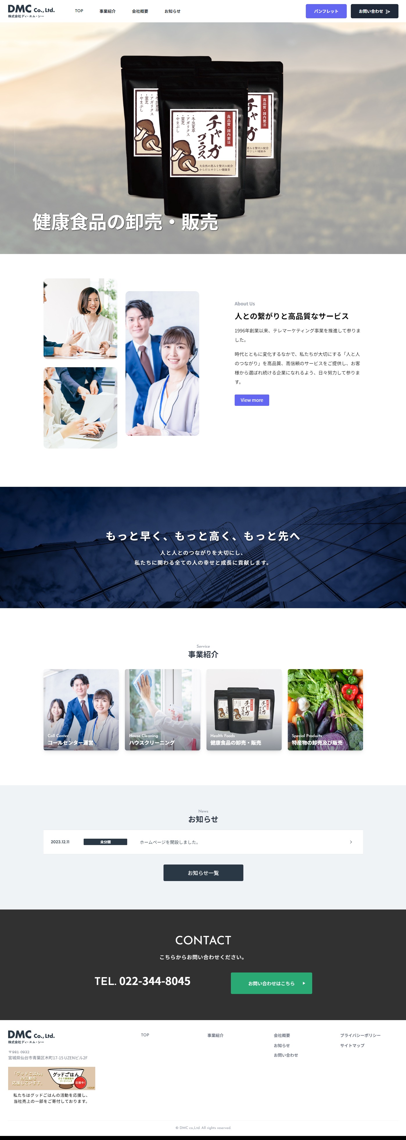 URL https://dmcinc.jp/ サービス内容 デザイン ディレクション サーバーホスティング サイト管理 株式会社ディ・エム・シーのオフィシャルサイトです。「人と人のつながり」を大切にテレマーケティング事業や健康食品や特産物の卸売・販売、コールセンター業務、ハウスクリーニングを行っています。