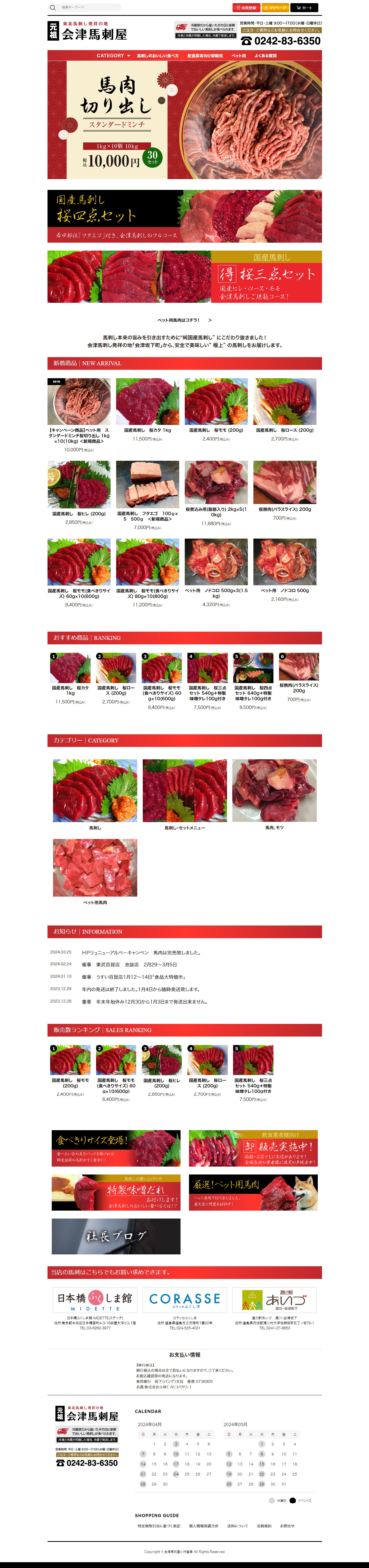 URL https://aizubasashi.com/ サービス内容 デザイン ディレクション ショッピングカート (ASP) 会津馬刺屋のECサイトです。純国産馬刺しにこだわり、安全で美味しい” 極上” の馬刺しの販売を行っています。