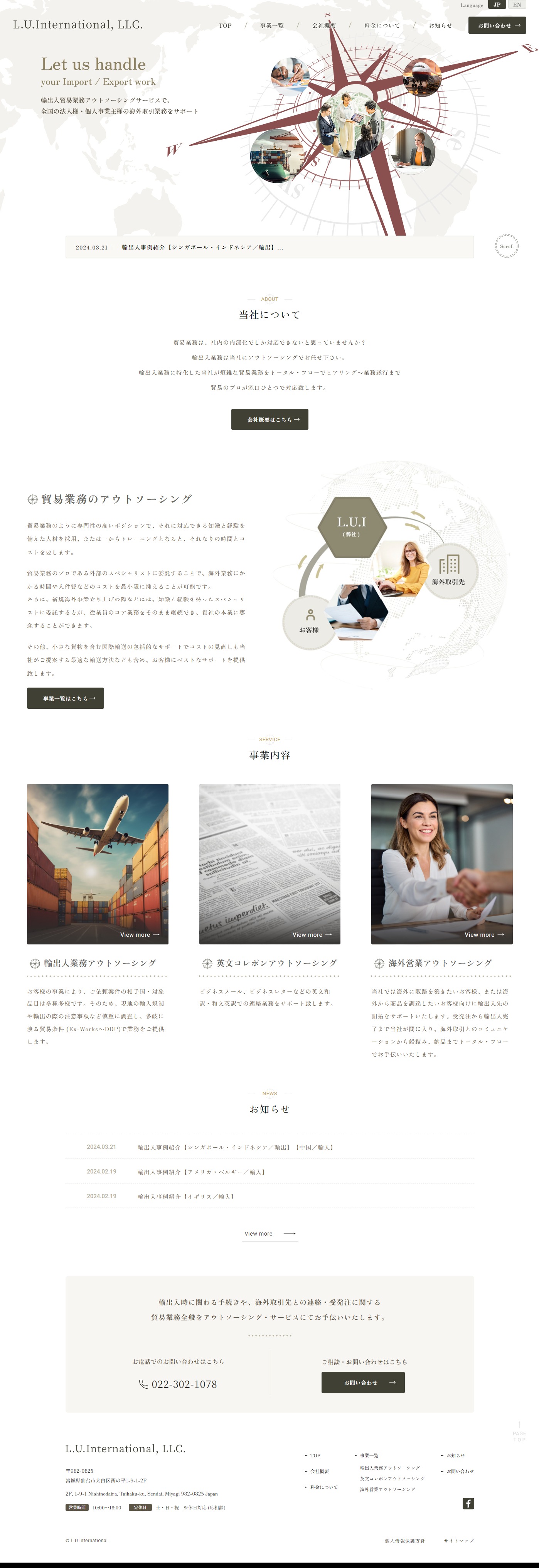 URL https://luinternational.jp/ サービス内容 デザイン ディレクション WordPress サーバーホスティング サイト管理 L.U.インターナショナル合同会社のオフィシャルサイトです。輸出入業務をトータル・フローでヒアリングから業務遂行まで行います。