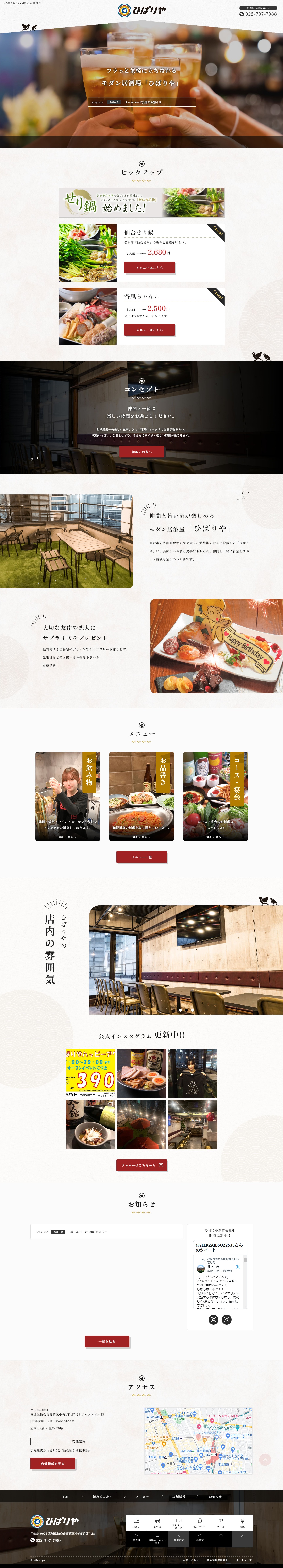 URL https://hibari-ya.com/ サービス内容 デザイン ディレクション サーバーホスティング サイト管理 株式会社うさぎやワークスひばりやのオフィシャルサイトです。美味しいお酒と食事はもちろん、スポーツ観戦も楽しめるモダン居酒屋です。