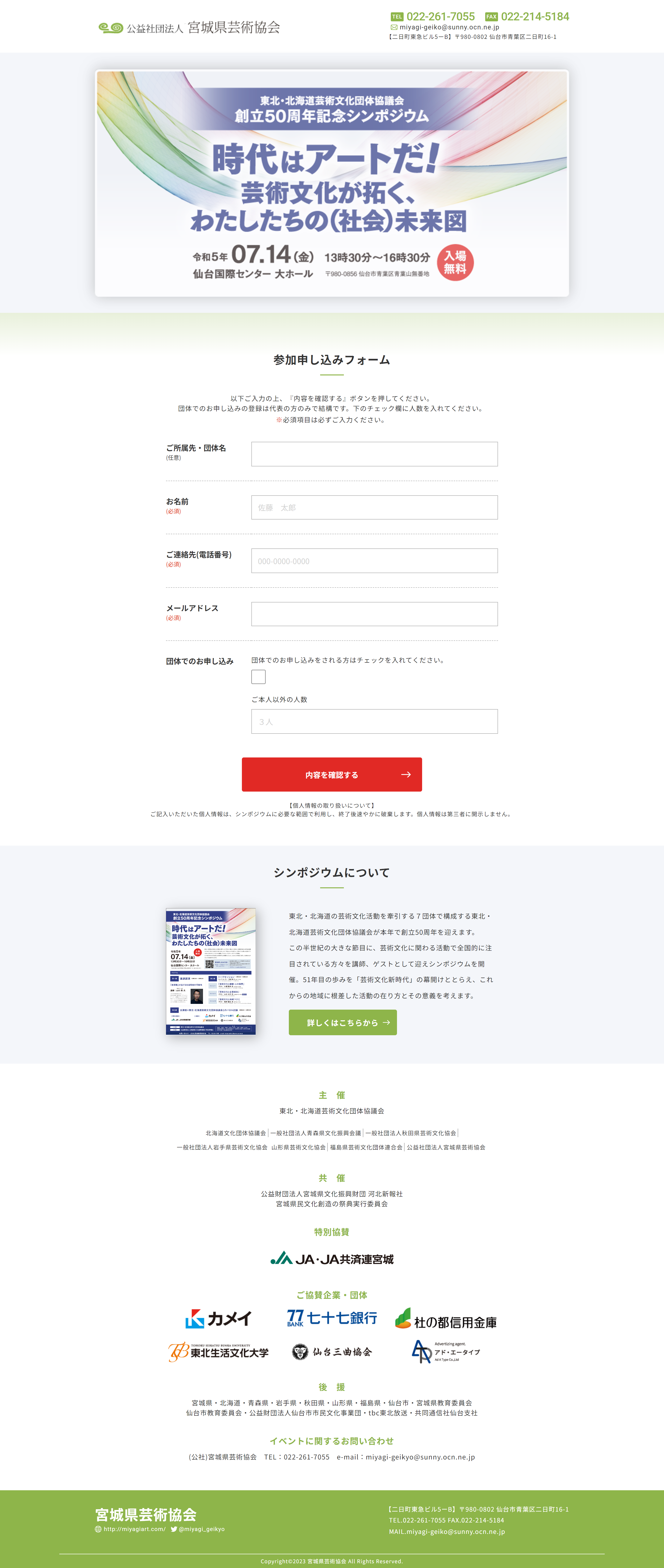 URL https://miyagigeikyo.com/ サービス内容 デザイン サーバーホスティング サイト管理 創立50周年記念シンポジウムのサイトです。同協会が参加する、東北・北海道芸術文化団体協議会の創立50周年記念シンポジウム開催に際し、イベント告知サイト、申込用フォームの作成を行いました。