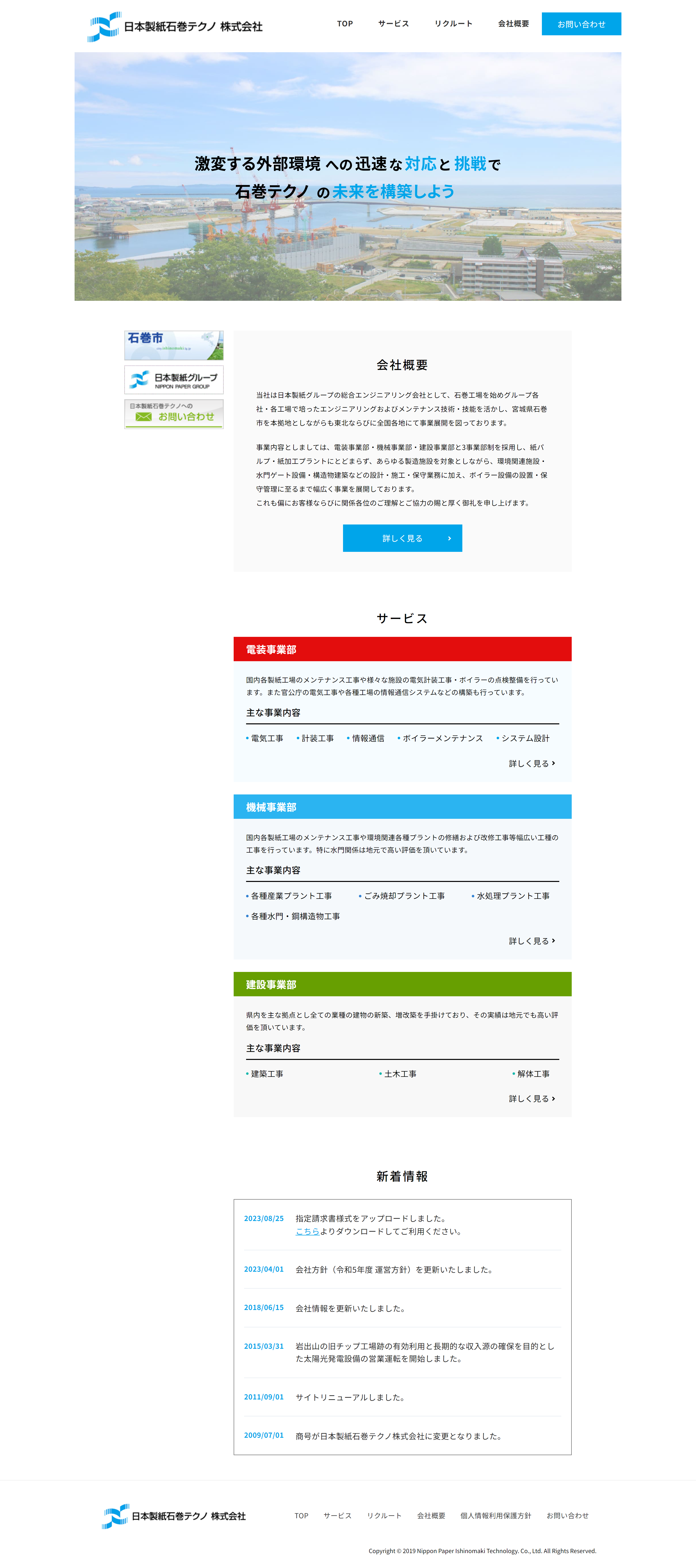 URL https://npi-techno.co.jp/ サービス内容 デザイン ディレクション 日本製紙石巻テクノ株式会社のオフィシャルサイトです。日本製紙グループの総合エンジニアリング会社として、宮城県石巻市を本拠地とし、東北ならびに全国各地で事業を展開されています。