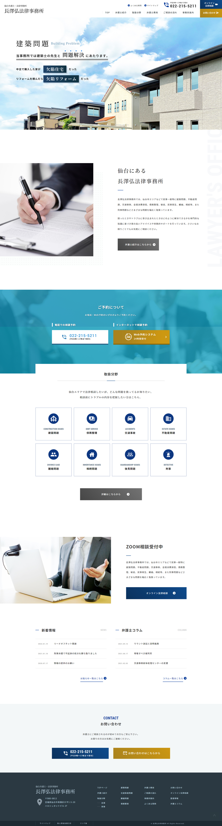 URL https://www.nagasawa-lawyer.jp/ サービス内容 デザイン ディレクション WordPress サーバーホスティング サイト管理 仙台の弁護士会に所属する法律事務所、長澤弘法律事務所様のWebサイトです。全体をリニューアルいたしました。建築問題は建築の専門家と共に問題解決に取り組んでいることなど取扱分野が分かりやすく伝わるようになっています。リニューアルにあわせてWebサイト上から24時間相談予約の受付可能とし、Zoomを利用した非対面のオンライン相談を開始しました。対面をご希望の場合も変わらず相談可能ですので初めての方も安心してお問い合わせください。