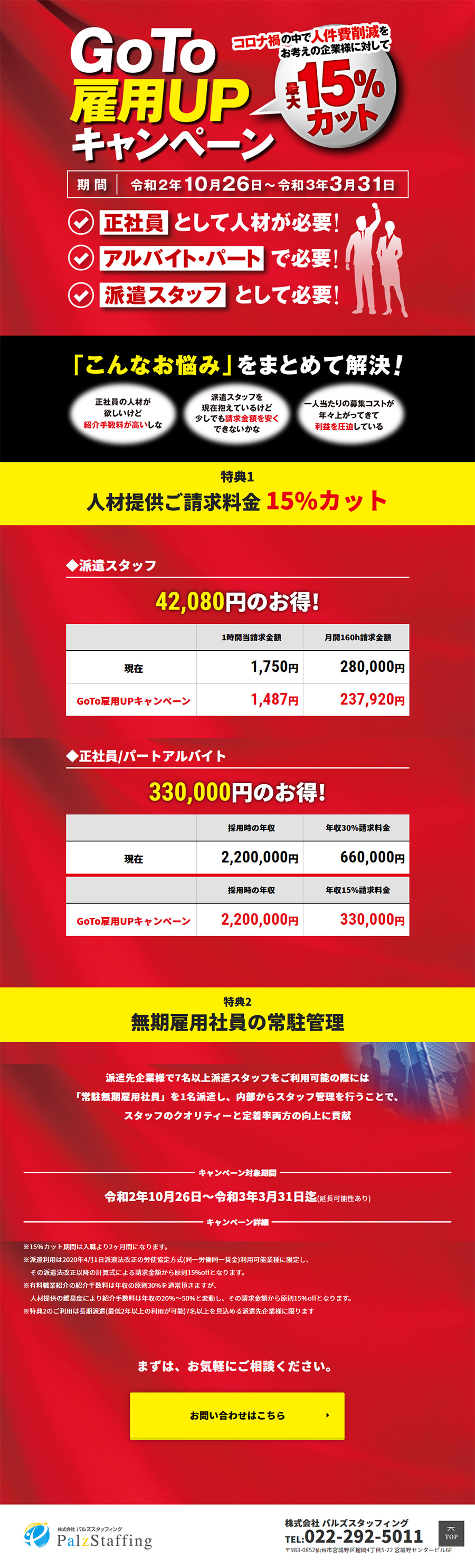URL https://www.palz-group.com/goto/ サービス内容 デザイン ディレクション システム開発 仙台市で人材派遣や職業紹介を営むパルズスタッフィング様のランディングページ(LP)です。印象に残るよう赤をベースにしたデザインで構成。お問い合わせ率を高めるよう工夫しています。