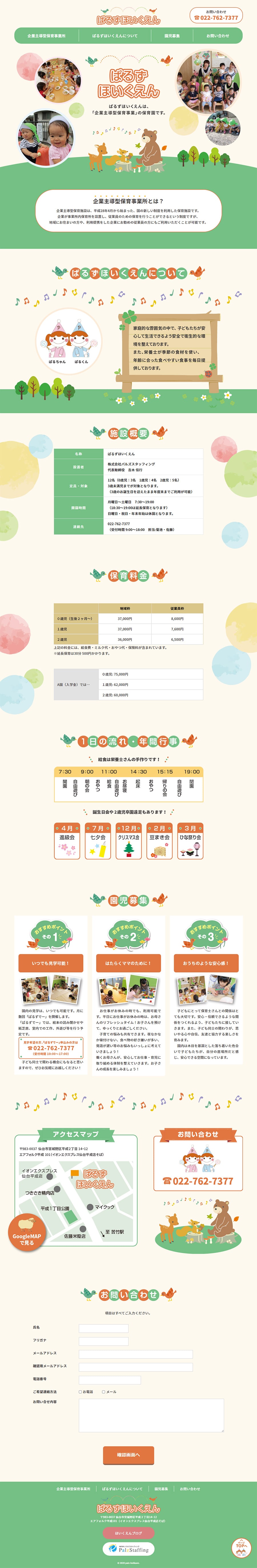 URL https://palz-hoikuen.com/ サービス内容 デザイン ディレクション システム開発 ぱるずほいくえん様は「企業主導型保育事業」として認定された仙台市の保育園です。楽しさあふれるデザインで、子ども一人ひとりを大切にする園であることを表現しました。