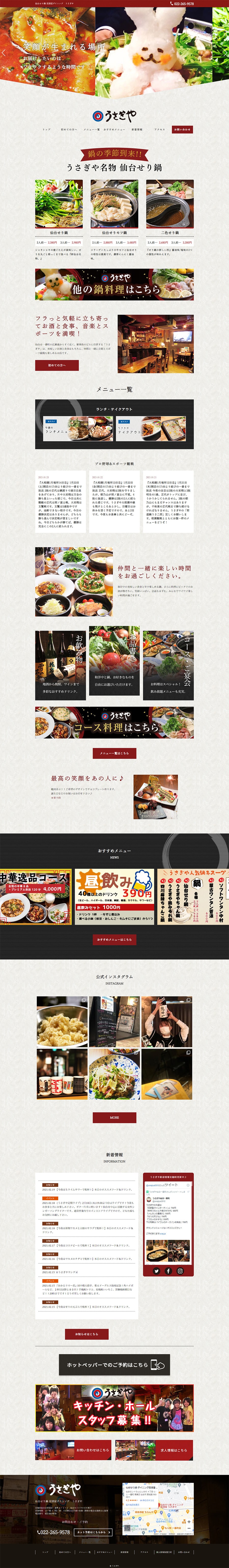 URL https://usag.jp/ サービス内容 デザイン ディレクション WordPress システム開発 サーバーホスティング サイト管理 美味しい食事とお酒、音楽とスポーツ観戦が楽しめるダイニング居酒屋うさぎや様のWEBサイトです。笑顔をコンセプトに、ワクワクする楽しさをデザイン。うさぎや様の想いを伝えられるよう心がけました。
