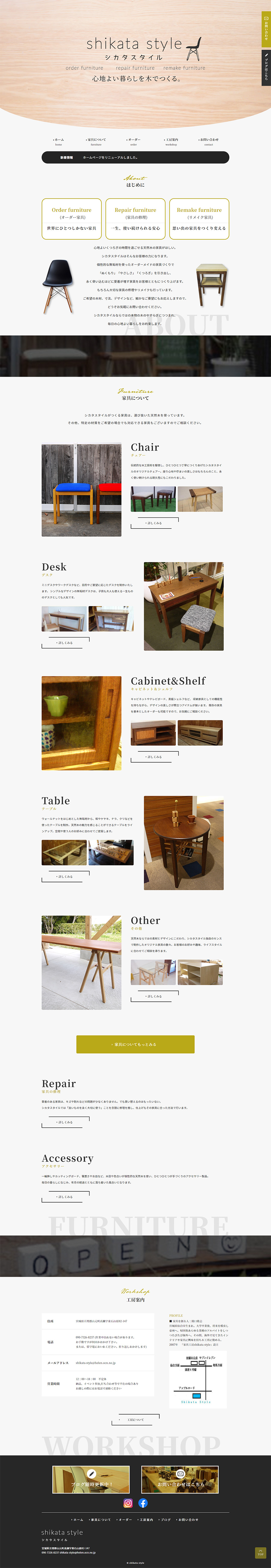 URL http://shikata-style.com/ サービス内容 デザイン ディレクション 映像制作 サイト管理 心地よい時間を過ごせる家具がほしい。そんなお客様の力になるシカタスタイル様のWEBサイトです。「ぬくもり」「やさしさ」「くつろぎ」を感じさせるデザインで、オーダーメイドの良さを伝えます。