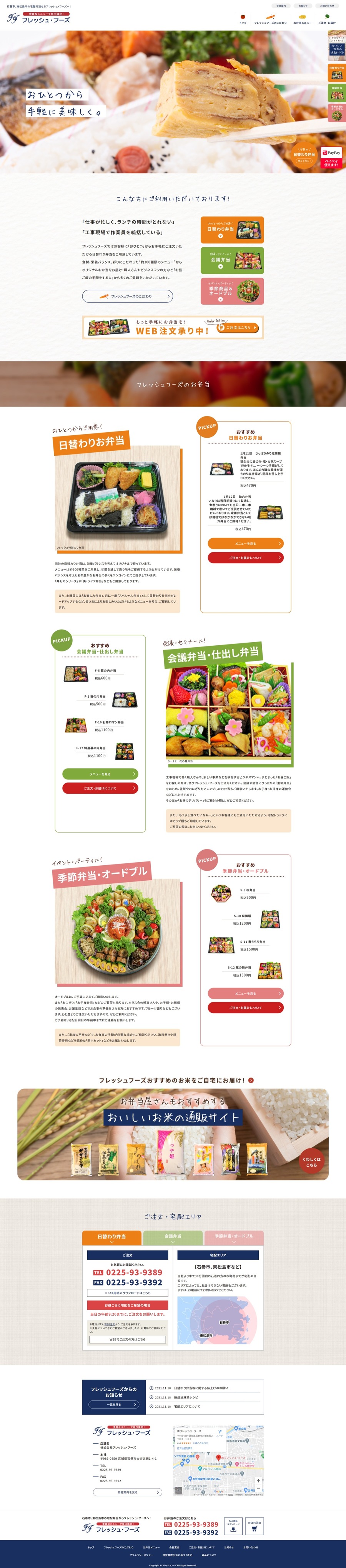 URL https://fresh-foods.co.jp/ サービス内容 デザイン ディレクション WordPress サーバーホスティング サイト管理 仙台・石巻のお弁当宅配・配達デリバリー、株式会社フレッシュ・フーズ様の公式WEBサイトです。全体をリニューアルいたしました。お客様に「おひとつ」からお手軽にご注文いただける日替わり弁当をご用意しています。