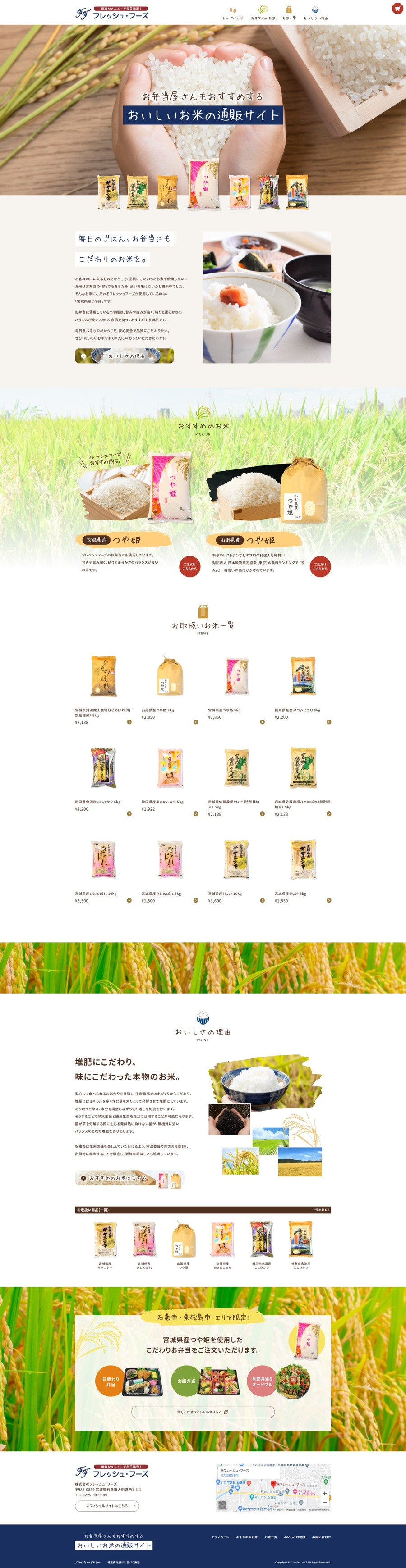 URL https://freshfoods.buyshop.jp/ サービス内容 デザイン ディレクション ショッピングカート (ASP) サイト管理 株式会社フレッシュ・フーズ様のECサイトです。 お弁当屋さんもおすすめする、おいしいお米をお求めの方は美味しいお米の通販サイトまで。