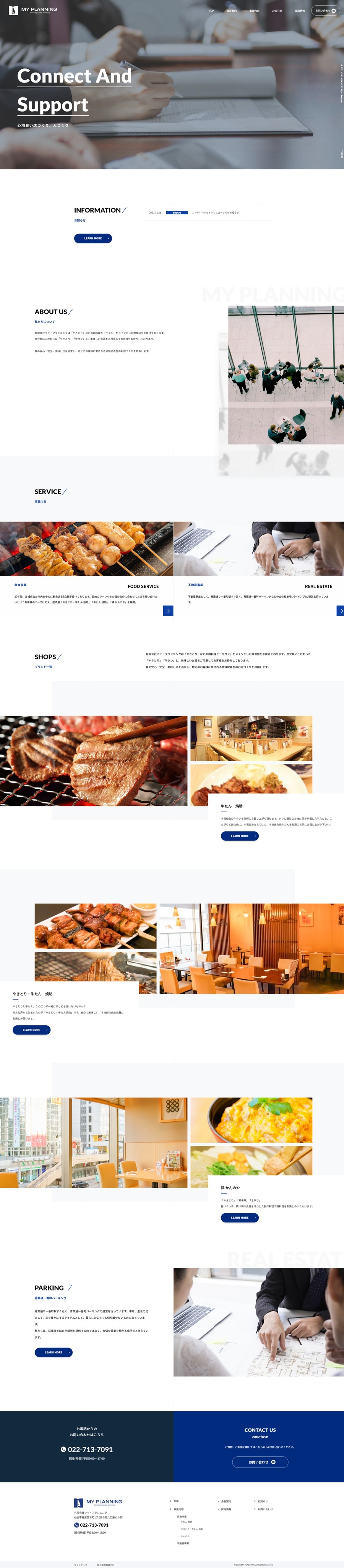 URL https://myplanning.co.jp/ サービス内容 デザイン ディレクション WordPress 写真撮影 サーバーホスティング サイト管理 有限会社マイ・プランニング様は、「やきとり」などの鶏料理と「牛タン」をメインとした飲食店を手掛けております。 炭火焼にこだわった「やきとり」「牛タン」と、美味しいお酒をご用意してお客様をお待ちしております。