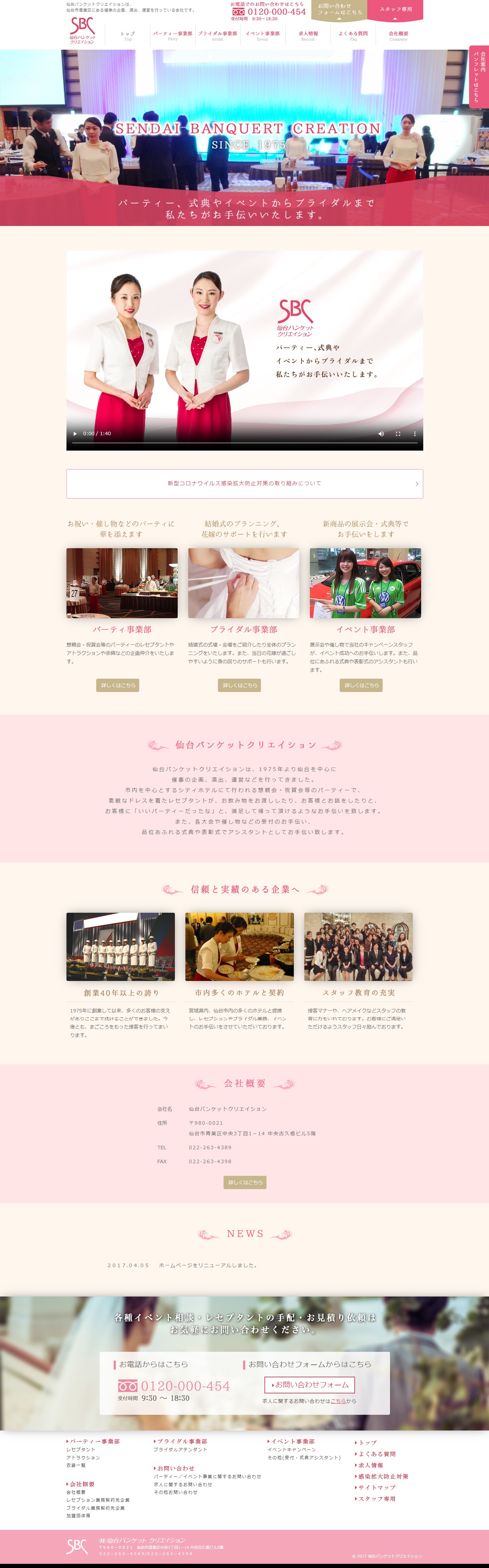 URL https://www.sendai-banquet.com/ サービス内容 サーバーホスティング パーティーや式典、イベントなどの企画、演出、運営などを行っている仙台バンケットクリエイション様のWEBサイトです。ロゴのピンクに合わせたテーマカラーでサイト全体を構成しています。