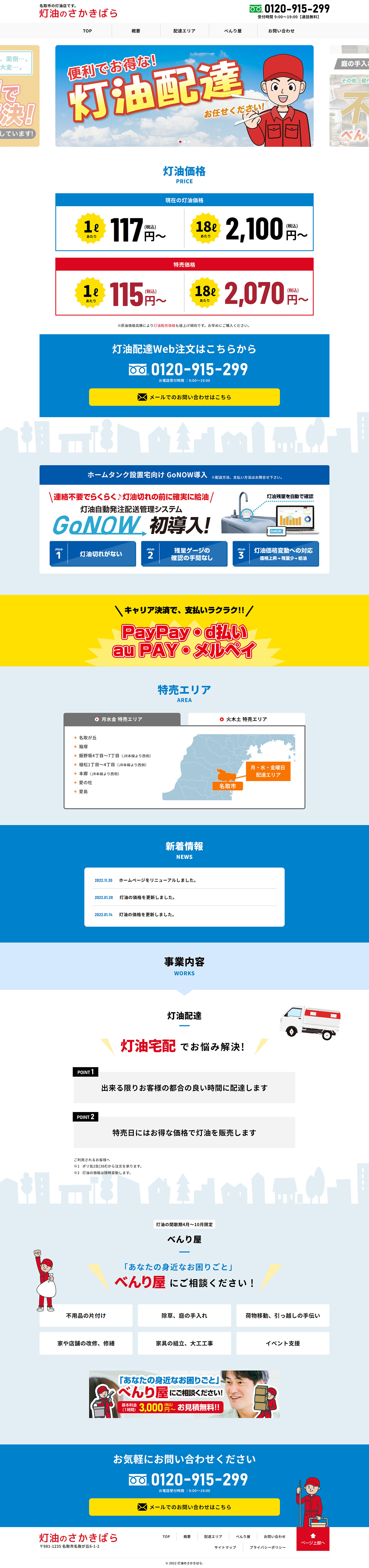 URL https://toyu-sakaki.com/ サービス内容 サーバーホスティング サイト管理 灯油のさかきばら様のWEBサイトです。お客様のご都合に合わせて配達していることを伝えるために、灯油価格や営業日カレンダー、配達エリアをメインコンテンツとして紹介しています。