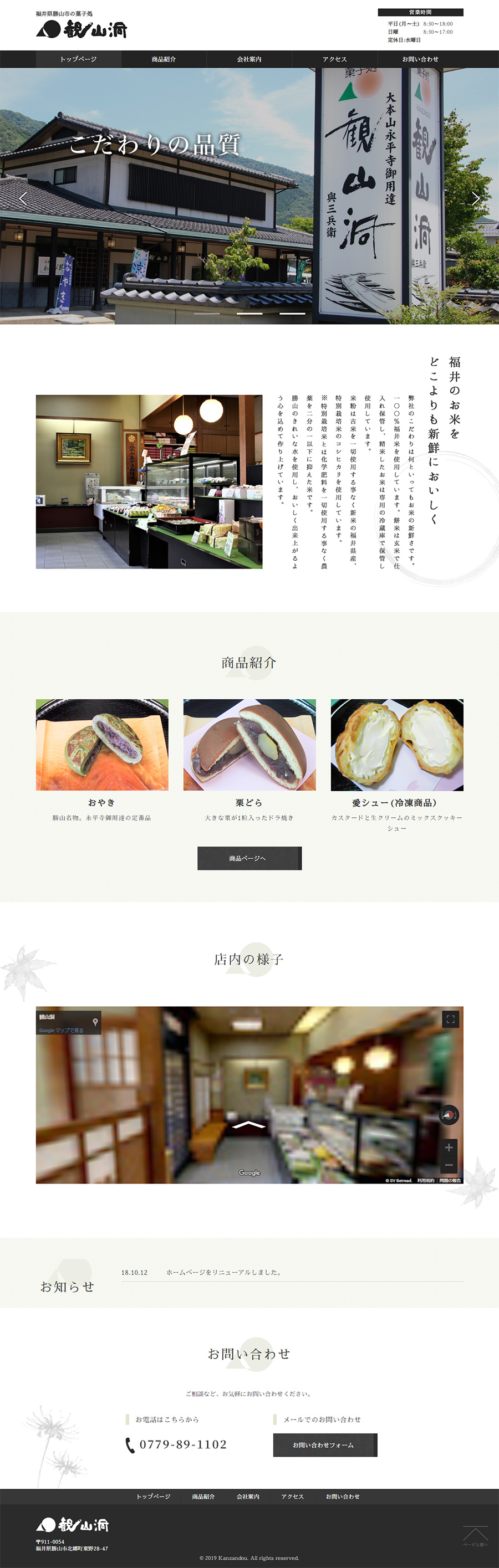 URL https://www.kanzandou.co.jp/ サービス内容 サーバーホスティング サイト管理 観山洞様は、創業以来、目に美しく味も優れた和菓子をつくり続けています。なかでも「禅」の焼印が入った“おやき”は、永平寺御用達の和菓子としてご愛用いただいている看板商品です。