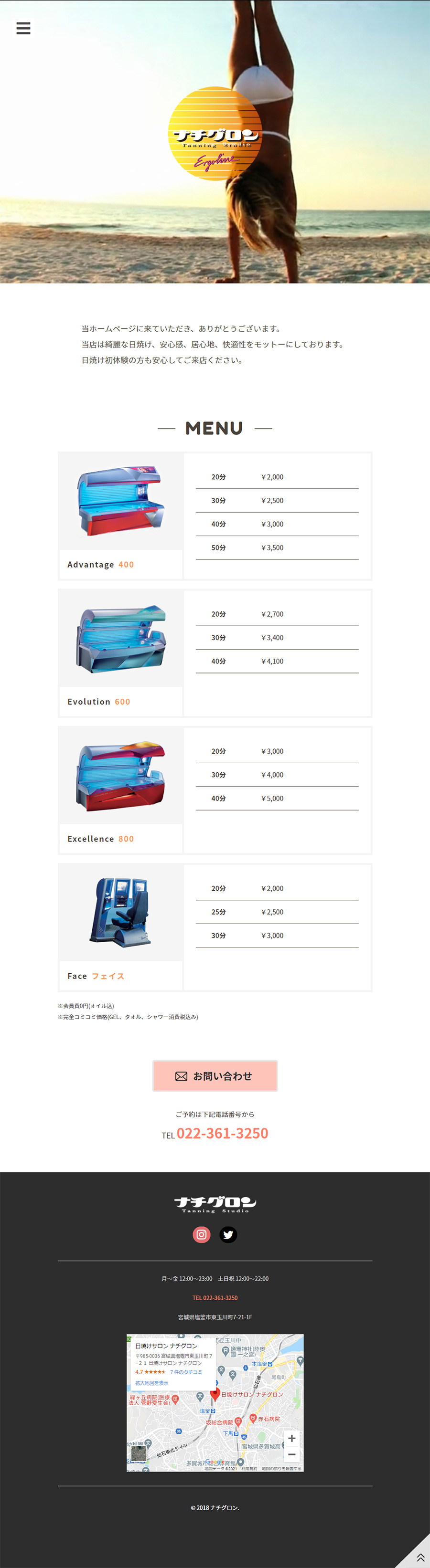URL http://nachi96.com/ サービス内容 デザイン ディレクション ナチグロン様は、塩釜市の日焼けサロンです。初めての方でも安心して来店いただけるよう、WEBサイトは日焼けマシンと料金の紹介、トピックス、ブログとシンプルな構成にしています。