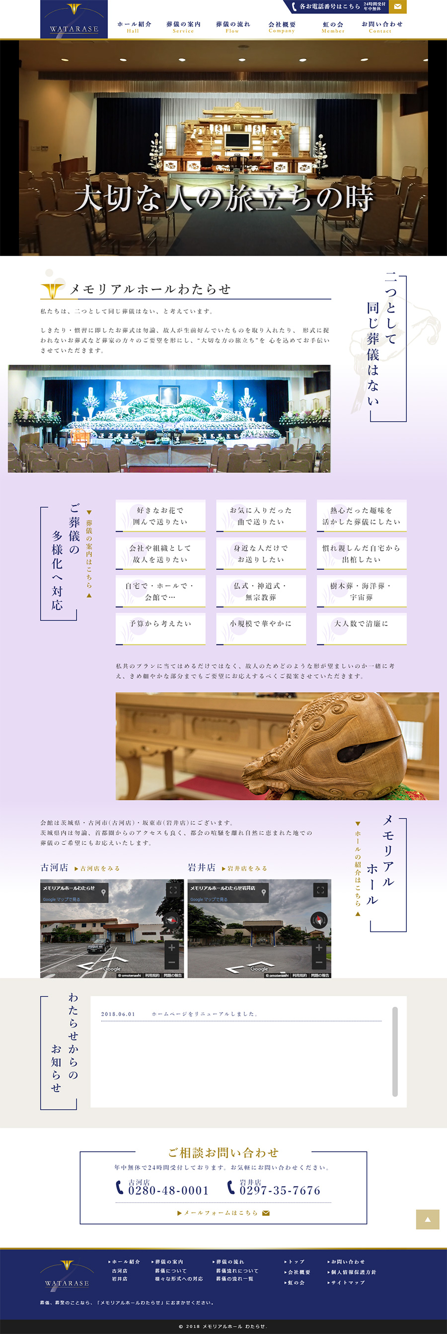 URL https://m-watarase.net/ サービス内容 サーバーホスティング サイト管理 わたらせ様のWEBサイトは、文字や背景を濃い青色にして落ち着いたイメージを表現。さらに多様化するご葬儀に合わせて、さまざま葬儀形式に対応できることをご案内しています。