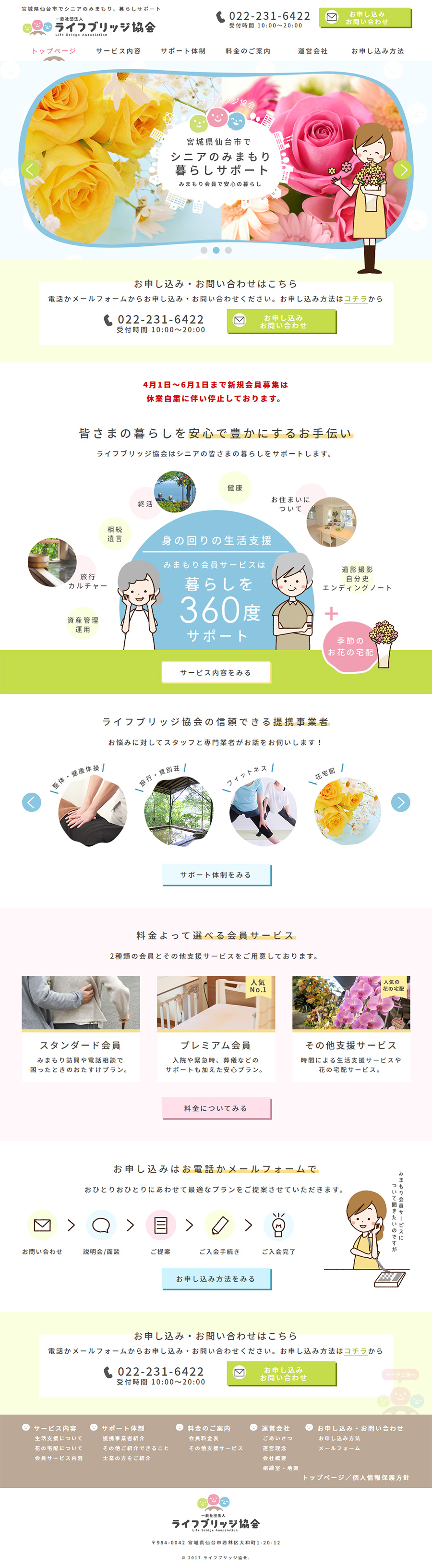 URL http://lifebridge-s.com/ サービス内容 デザイン ディレクション ライフブリッジ協会様の「みまもり会員サービス」を紹介するWEBサイトです。相談内容に応じて信頼できる事業者を紹介することで安心して豊かな生活を送れることが喜ばれています。
