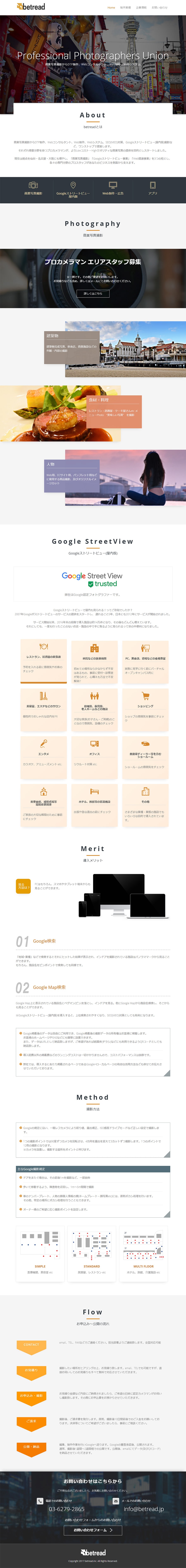 URL https://betread.jp/ サービス内容 デザイン ディレクション サーバーホスティング サイト管理 ビートレッド様は、仙台・名古屋・大阪で「商業写真」「Googleストリートビュー」などのサービスを展開。プロカメラマンが撮影する写真の品質が一目でわかるよう工夫しています。
