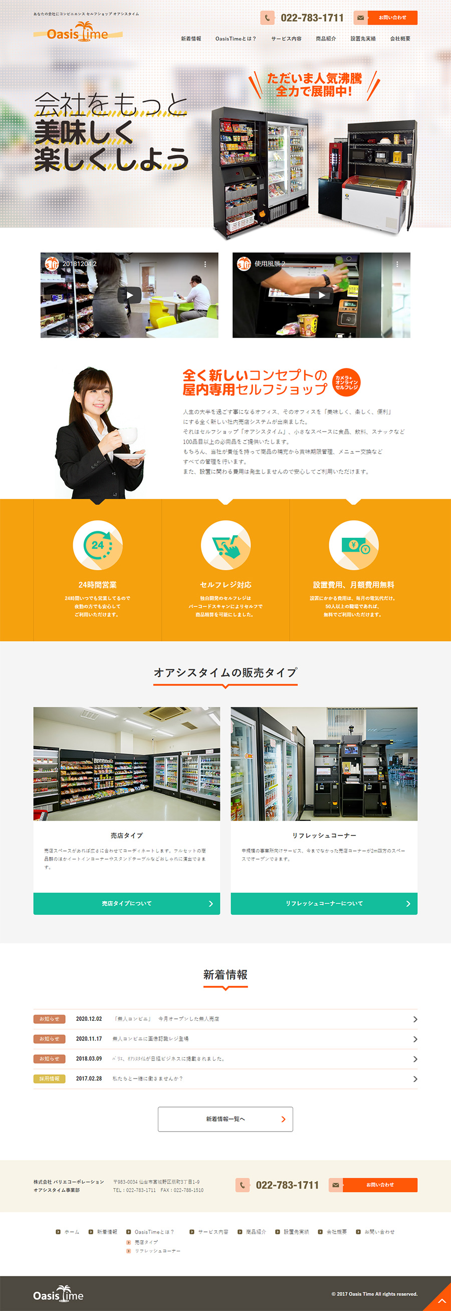 URL https://oasistime.jp/ サービス内容 デザイン ディレクション WordPress サーバーホスティング サイト管理 会社オフィスに小さなコンビニのような社内売店システムを導入できるオアシスタイム様のWEBサイトです。無人販売の仕組みをわかりやすく伝えることでメリットを感じていただけるよう構成しています。