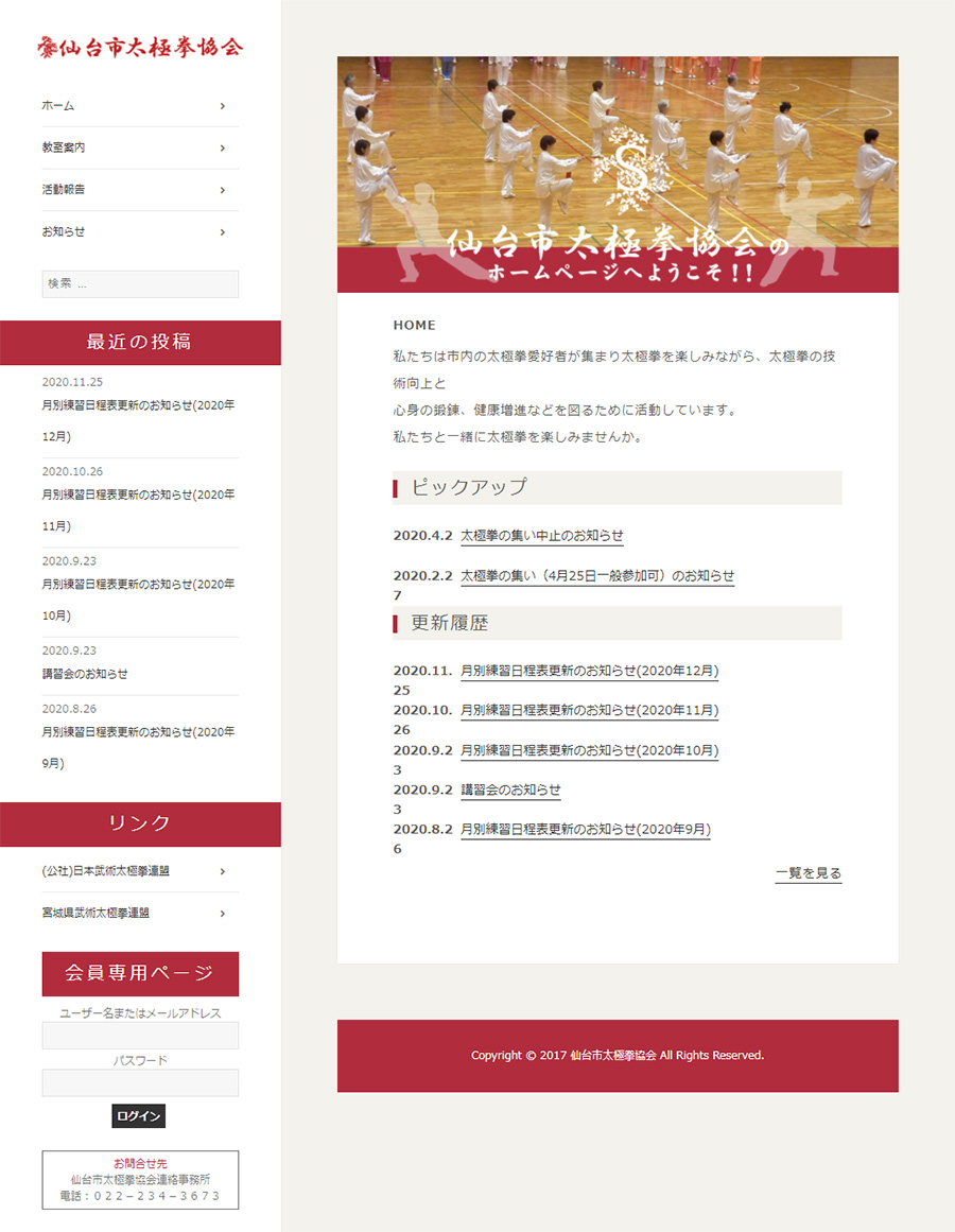 URL http://sendai-ta.com/ サービス内容 サーバーホスティング サイト管理 仙台市内で活動している仙台市太極拳協会様のWEBサイトです。各曜日ごとに教室や講習会のお知らせ、会員専用ページの設定など、コミュニケーションの中心で利用されています。