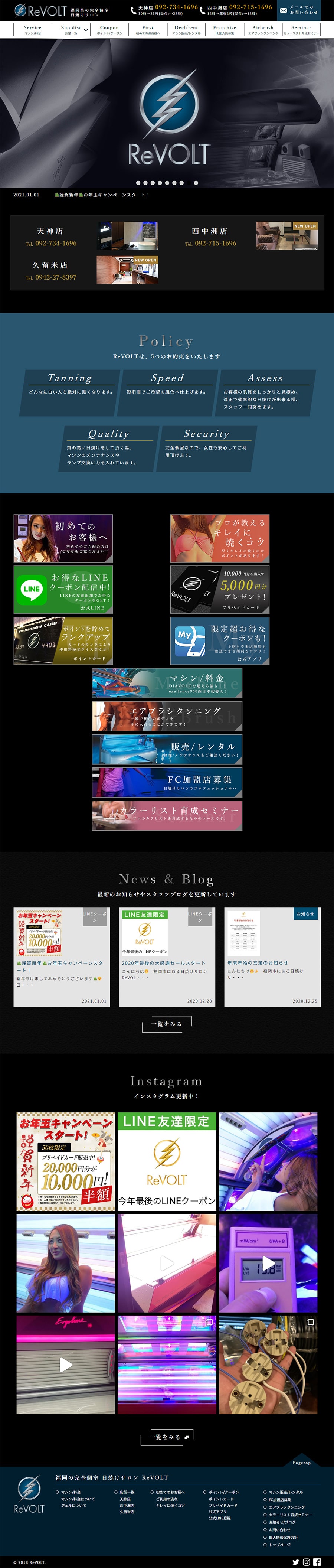URL https://www.revolt.co.jp/ サービス内容 デザイン サーバーホスティング 福岡県にある日焼けサロン リボルト様のWEBサイトです。全ページにわたり日焼けをイメージしたデザインを採用。グラデーションや写真により安全できれいな日焼けを表現しました。