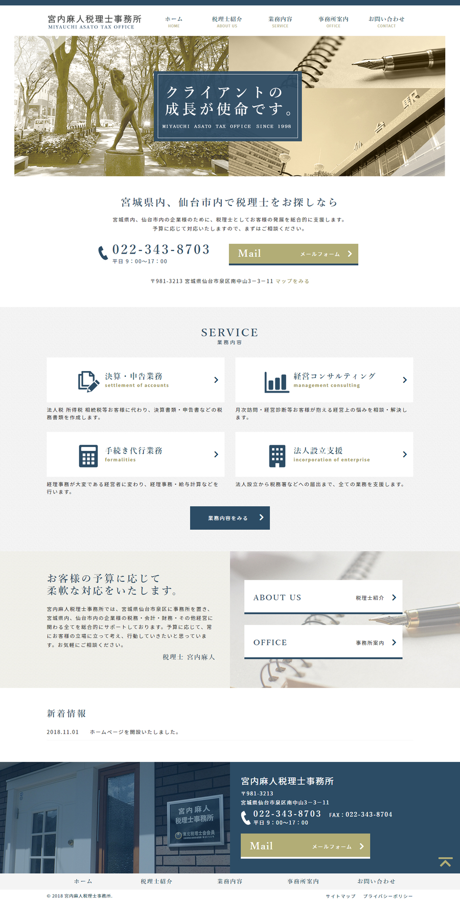 URL http://miyauchi-tax.jp/ サービス内容 デザイン ディレクション サーバーホスティング サイト管理 宮内麻人税理士事務所様は、税務・会計・財務など経営に関わるすべてをサポート。複雑な業務をシンプルなサイト構成とデザインにすることで、わかりやすくなるよう工夫しています。