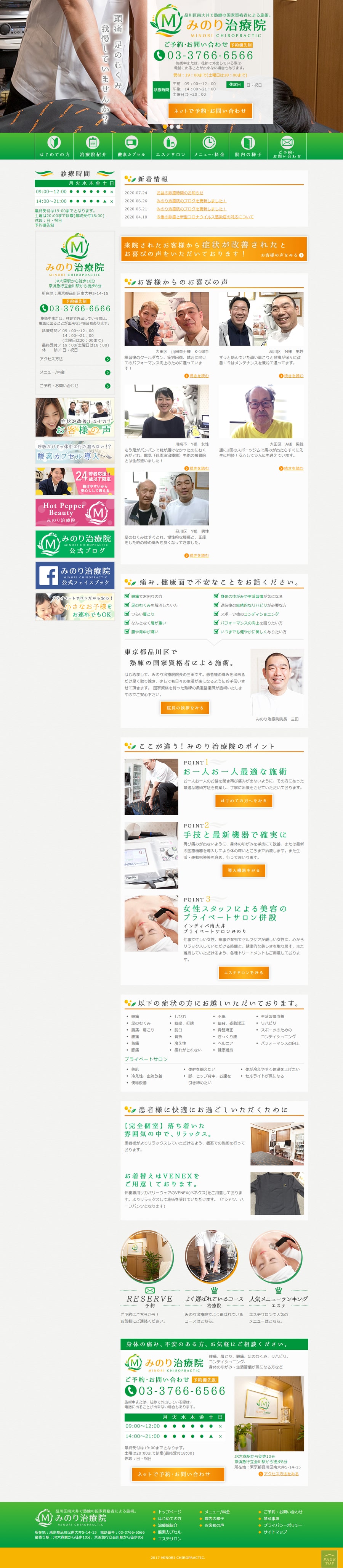 URL https://minori-shinagawa.com/ サービス内容 デザイン サイト管理 みのり治療院様のWEBサイトは、優しさや安心を感じさせるグリーンをテーマカラーに設定。施術前の不安をできるだけ早く取り除き、少しでもリラックスできるデザインを心がけました。