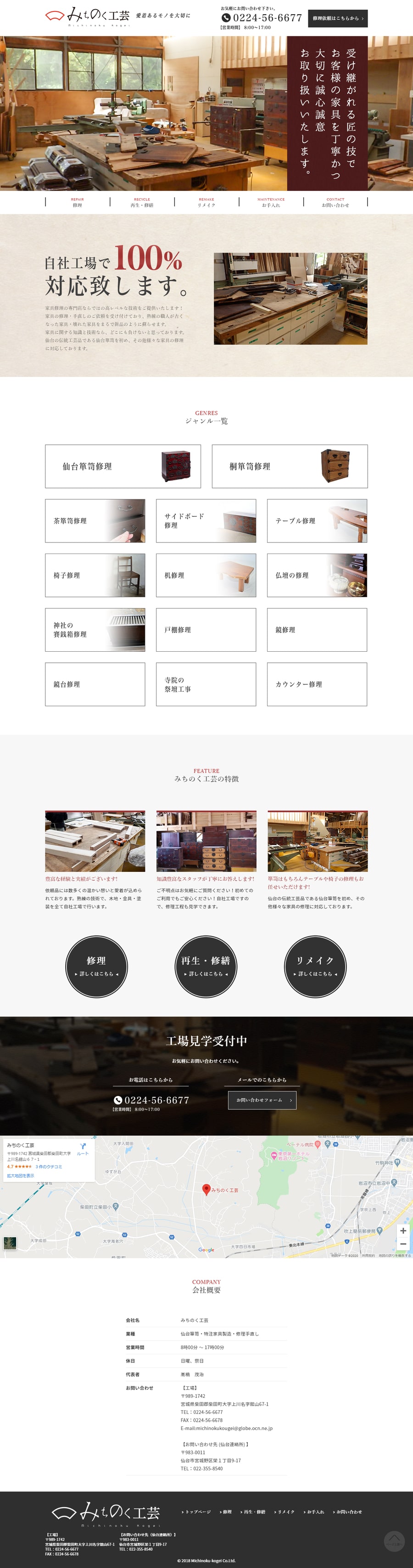 URL https://michinokukougei-repair.com/ サービス内容 デザイン ディレクション サーバーホスティング サイト管理 家具修理の専門店、みちのく工芸様のWEBサイトです。色味をおさえ画像を大きく大きく見せることで、全体的にモダンで落ち着いた雰囲気のビジュアルに仕上げています。
