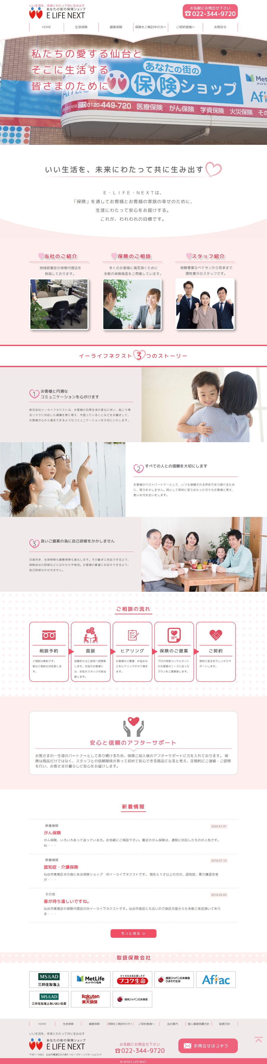 URL https://e-life-next.co.jp/ サービス内容 デザイン サーバーホスティング サイト管理 仙台市の保険代理店イーライフネクスト様のWEBサイトです。ロゴマークにあるハートをモチーフにしたいとのご希望があり、安心感を与えられるようなやわらかいデザインを意識しました。
