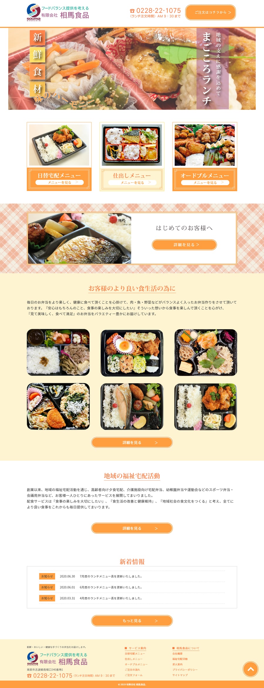 URL https://soumasyokuhin.jp/ サービス内容 デザイン サーバーホスティング サイト管理 宮城県栗原市を中心にお弁当の宅配を行っている相馬食品様のWEBサイトです。お弁当の画像をふんだんに使用し、見やすさと分かりやすさを意識して制作させていただきました。