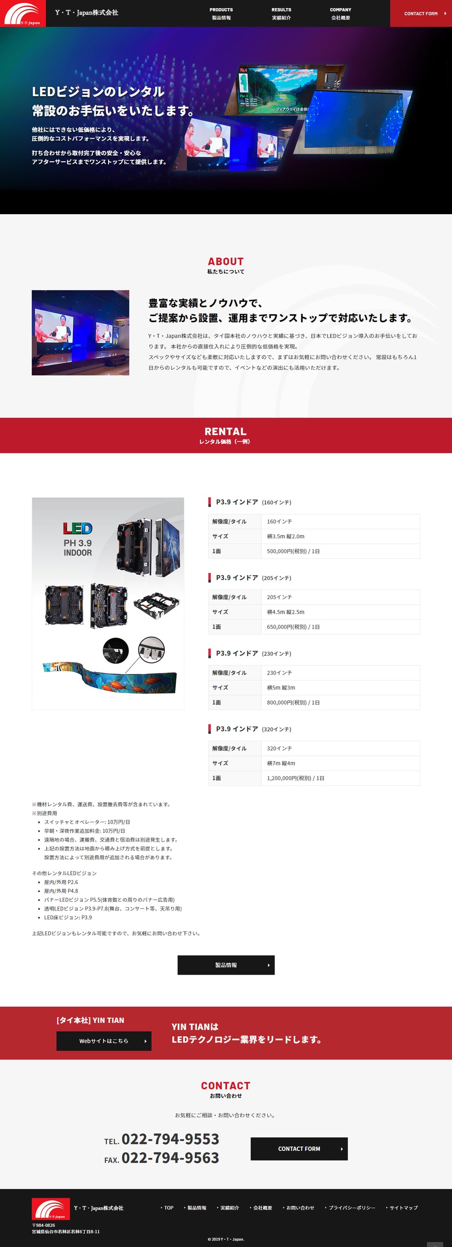 URL https://y-t-japan.com/ サービス内容 デザイン ディレクション WordPress サーバーホスティング サイト管理 Y・T・Japan様は、LEDディスプレイの販売およびレンタルを業務とする企業です。広告代理店やホテルなどが取引先のため、利用シーンがイメージできるよう多くの実績を紹介しています。