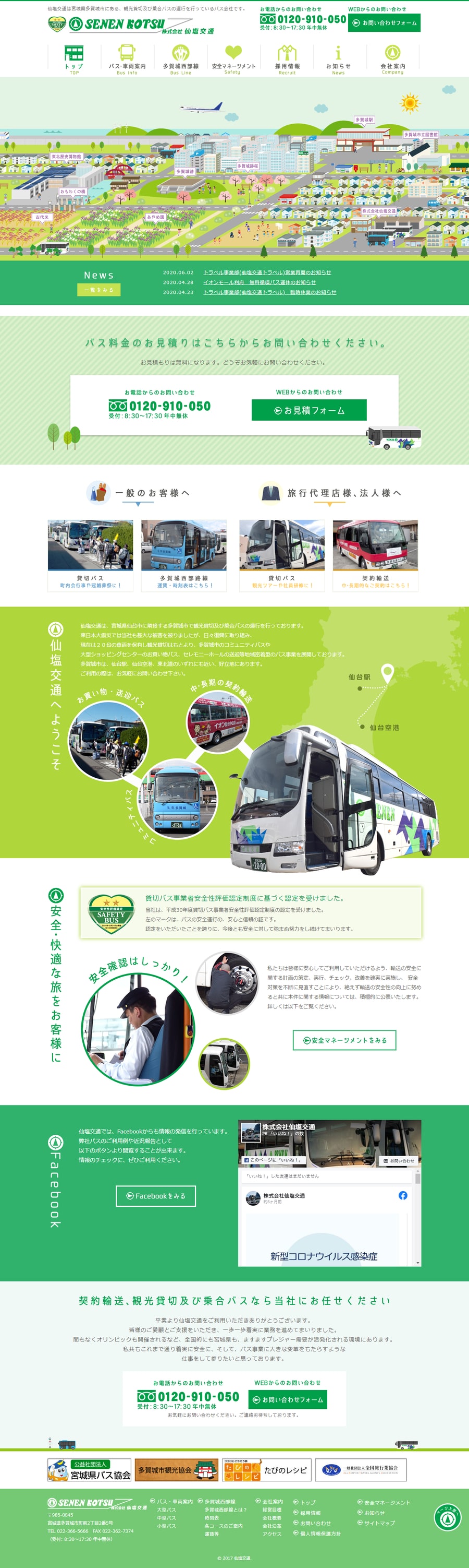 URL https://www.senenkotsu.com/ サービス内容 デザイン サーバーホスティング 仙塩交通様は、宮城県多賀城市で観光貸切および乗合バスの運行を行っています。メインビジュアルのイラストに動きを入れるとともに、写真などを大きく見せるレイアウトにしています。