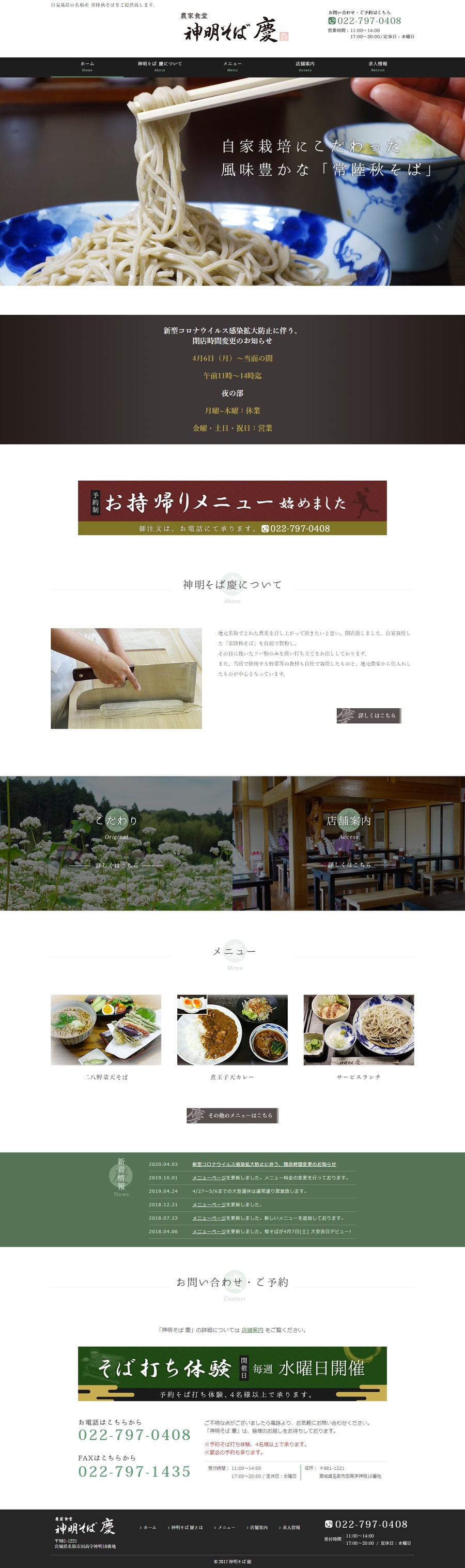 URL https://www.shinmeisobakei.com/ サービス内容 デザイン サーバーホスティング サイト管理 神明そば 慶 様は、仙台・名取の手打ちそば専門店です。自社栽培のそば粉の美味しさをアピールするため、写真を大きく使用し、こだわりを伝えられるようデザインしました。