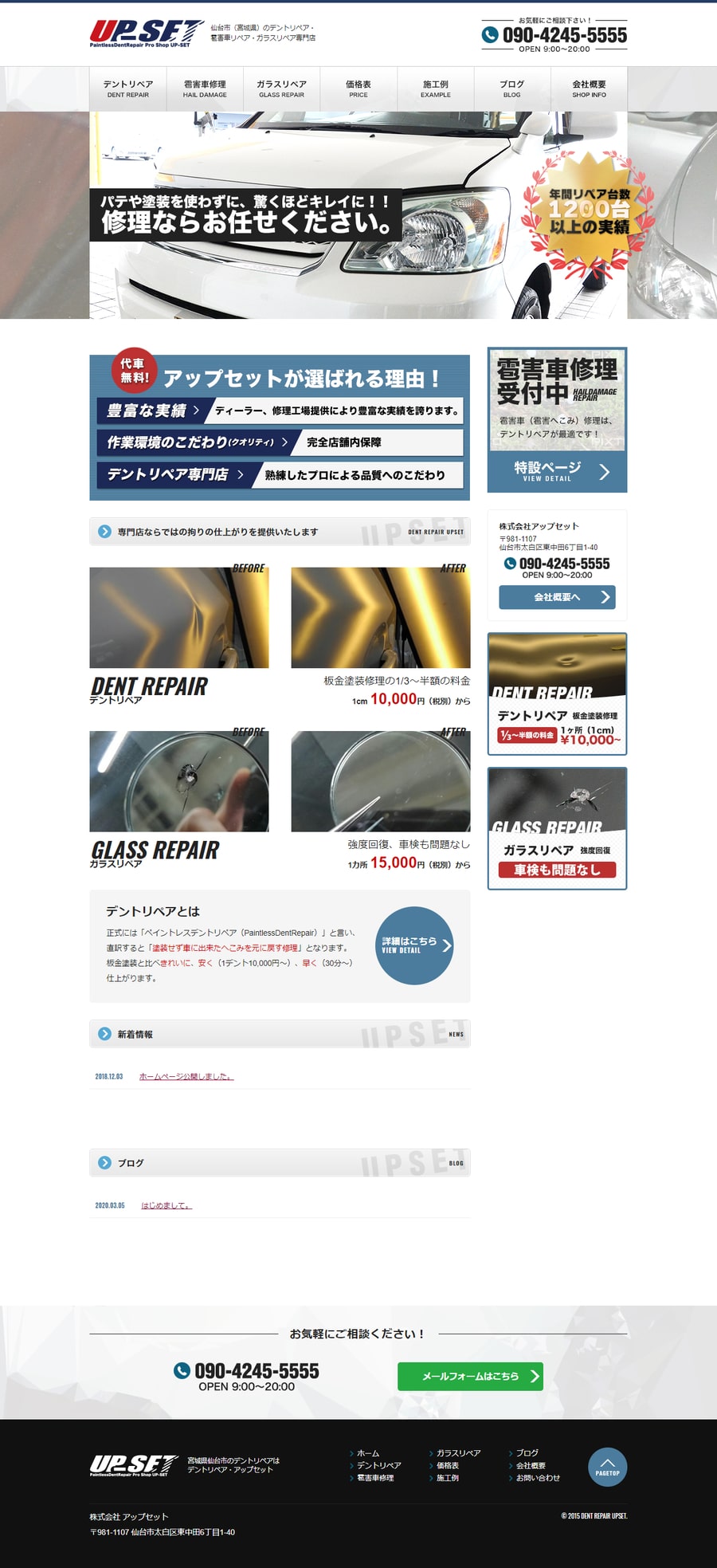 URL http://dent-upset.com/ サービス内容 デザイン ディレクション WordPress サーバーホスティング サイト管理 デントリペア・ガラスリペア専門店 アップセット様の業務内容や施工例を紹介するWEBサイトです。丁寧な仕事ぶりや魅力を詳しく発信することで、信頼感をさらに高めることができました。