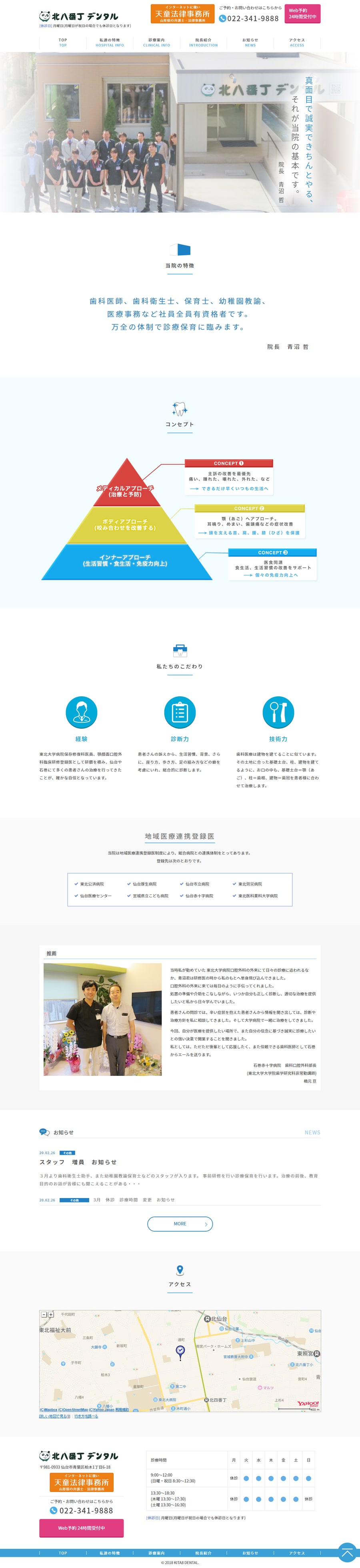URL http://www.kita8-dental.com/ サービス内容 デザイン ディレクション WordPress サーバーホスティング サイト管理 仙台市にある歯科医院 北八番丁デンタル様のWEBサイトです。清潔感と信頼感をイメージした色合いに、わかりやすくシンプルな構成で仕上げました。